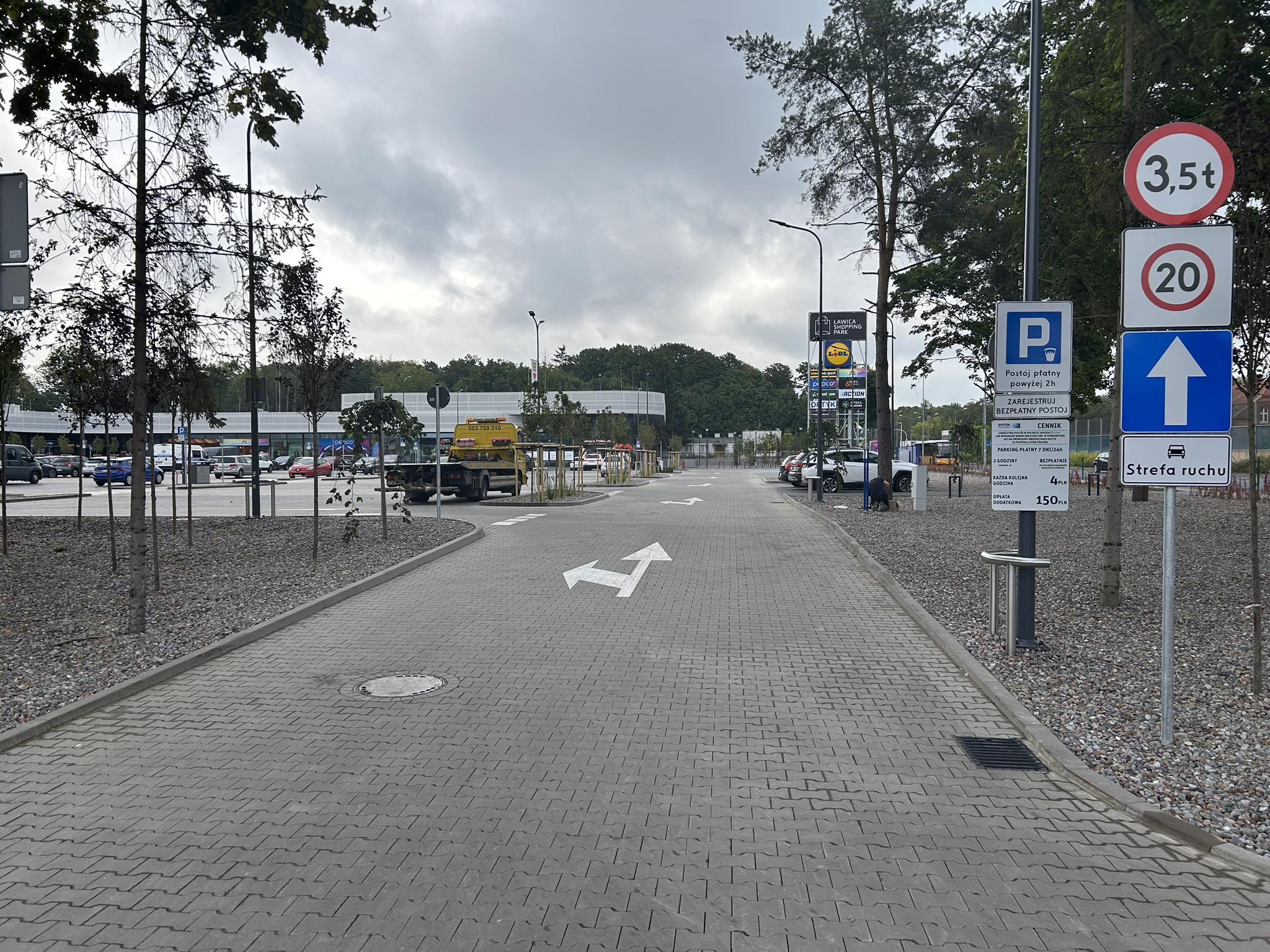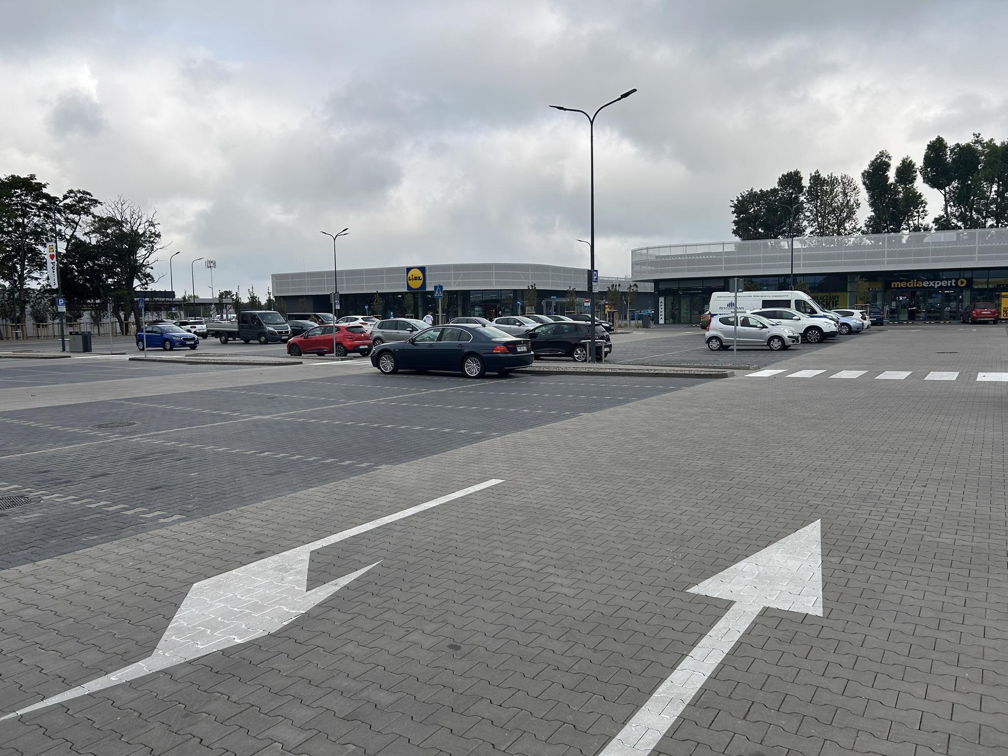Carpark located next to shopping center in Poznań.