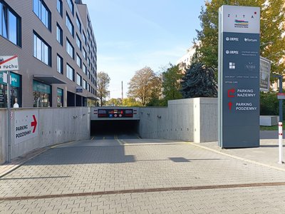 Single-level underground car park divided into two parts: the first one located under the Promenada ZITA office building, the second one under the Promenady Wroclawskie housing estate. There are 380 parking spaces and five charging points for electric cars. The car park is monitored 24 hours per day.
