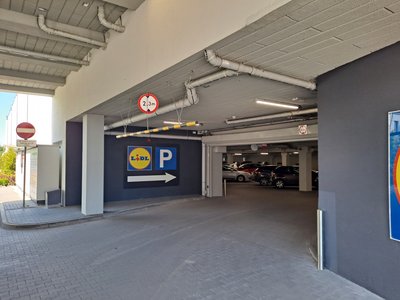 Parking zlokalizowany przy markecie Lidl, budynek o wielkopoziomowej konstrukcji z wjazdem głównym od Al. Rzeczypospolitej.