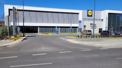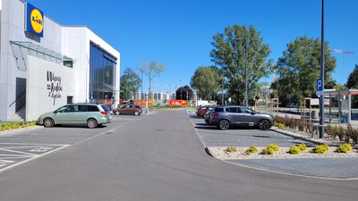 Parking przy markecie Lidl z dwoma wjazdami od ul. Żupniczej i Chodakowskiej w Warszawie.